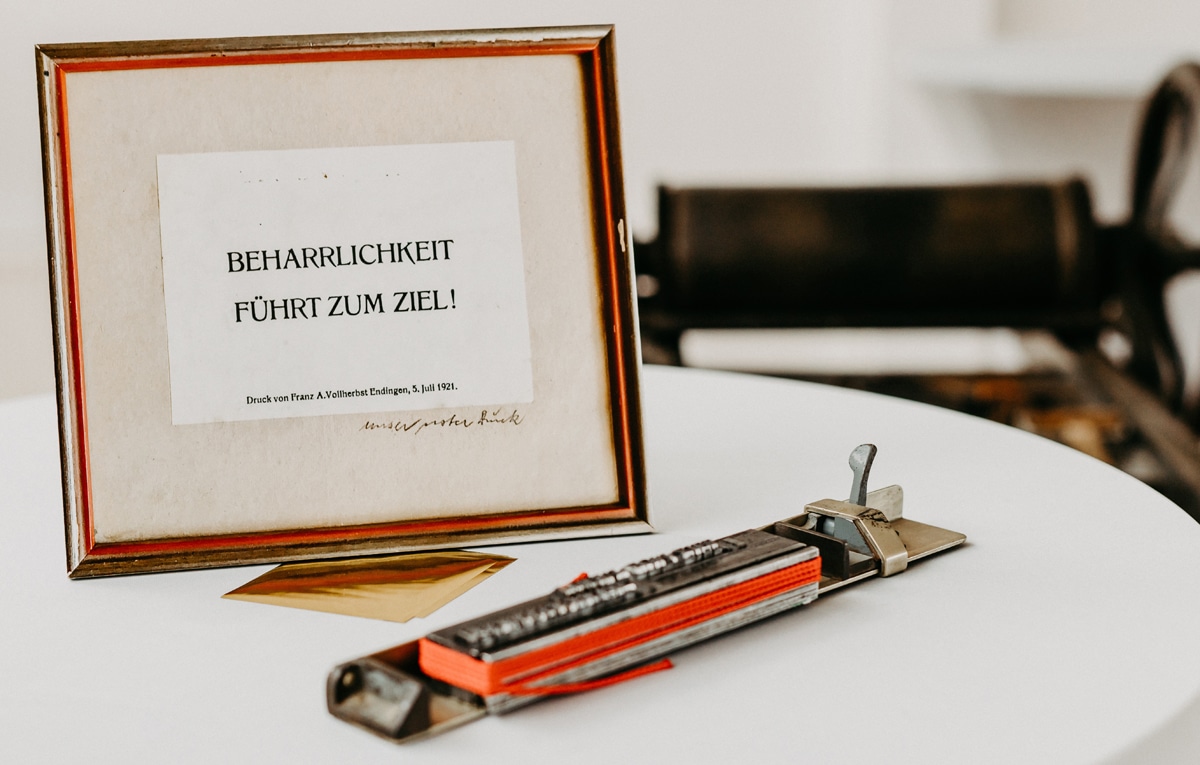 Das Familienunternehmen feierte indem die alte Tiegeldruckpresse von 1921 zum Leben erweckt wurde: Erneut entschied sich die Familie Vollherbst für den Druck der bedeutungsvollen Worte „Beharrlichkeit führt zum Ziel“. Ein bewegender Moment für die Familie und für alle über 100 Mitarbeiter:innen am Standort Endingen. Das Unternehmen ist sowohl familiengeführt als auch in Familienbesitz – heutzutage keine Selbstverständlichkeit mehr.