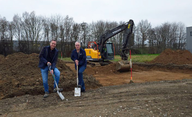 Erster Spatenstich für den Ausbau durch die Managing Directors Ralf Wirtz und Michael Leidgschwendner. Mit dem Erweiterungsbau wird sich die Produktionsfläche der ABG in Baesweiler nahezu verdoppeln. (Bild: A B Graphic International Ltd.)