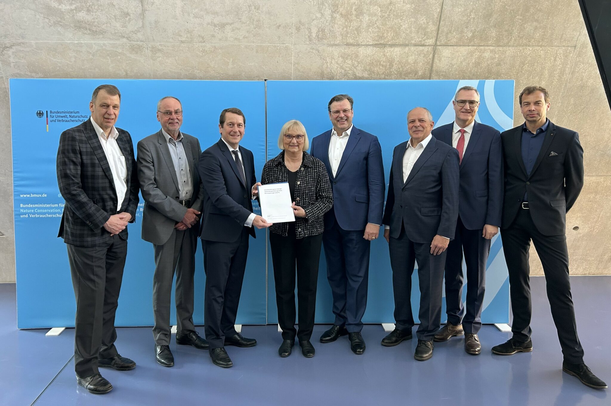Vertreterinnen und Vertreter der Trägerverbände haben die Garantieerklärung bei einem Termin im Bundesministerium für Umwelt, Naturschutz, nukleare Sicherheit und Verbraucherschutz (BMUV) an die Parlamentarische Staatssekretärin Dr. Bettina Hoffmann übergeben.