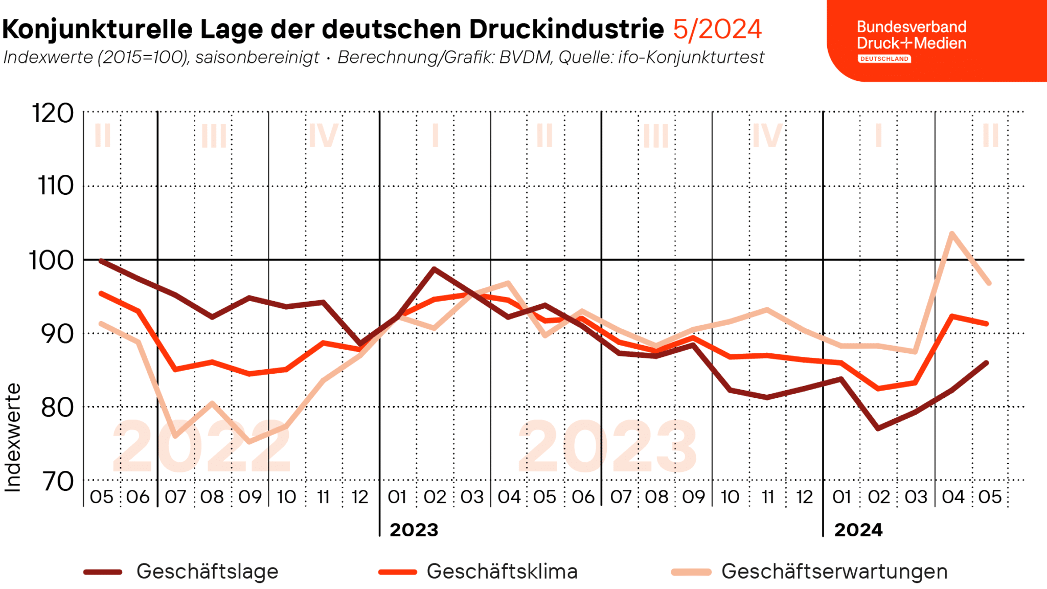 Nach dem deutlichen Anstieg im April ging das saison- und kalenderbereinigte Geschäftsklima der deutschen Druck- und Medienwirtschaft im Mai 2024 leicht zurück. Maßgeblich bestimmt wurde der Rückgang des Geschäftsklimas durch die Abnahme der Geschäftserwartungen, während der Geschäftslageindex seine im Februar begonnene Erholungsentwicklung auch im Mai fortsetzte.(Bild: BVDM)