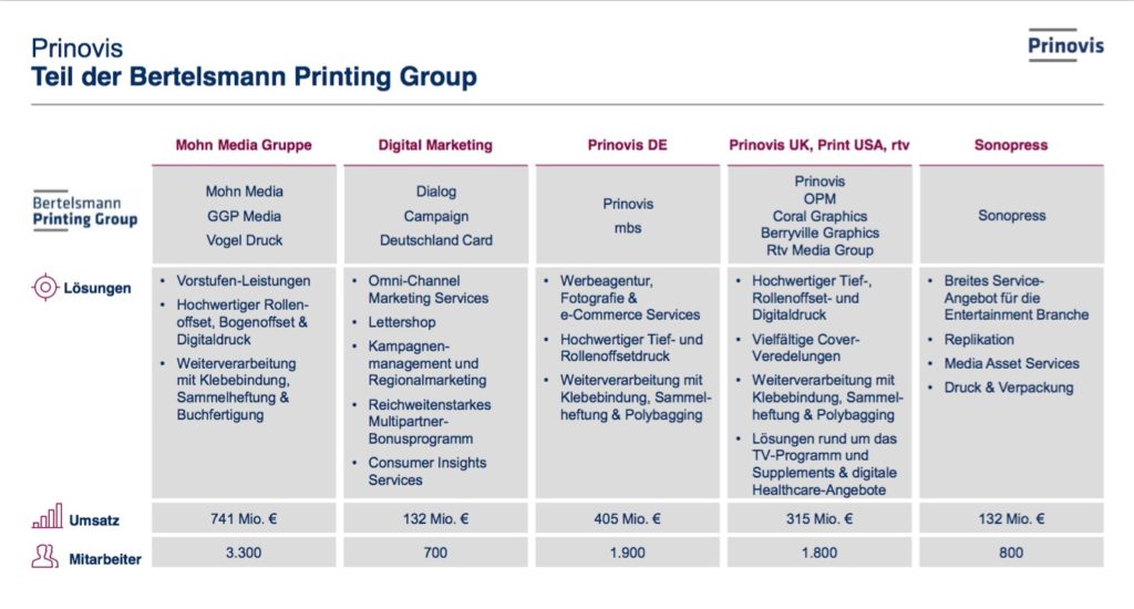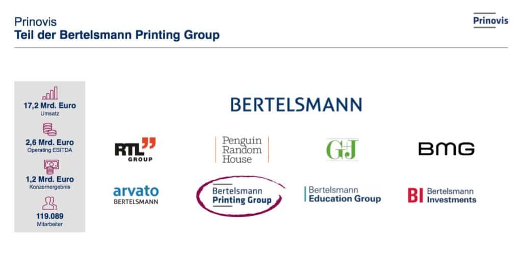 Der international tätige Bertelsmann-Konzern zählt zu den weltweit größten Medienunternehmen. Die 2016 gegründete Bertelsmann Printing Group ist Teil des Konzerns und »Mutterunternehmen« von Prinovis. [6354]