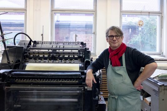 Und was geschieht im Landes Gutenbergs mit Gutenbergs Erbe? Gedruckte Text- und Bildmedien sind seit fast 600 Jahren Teil der europäischen Kultur und Wissensgesellschaft, in Deutschland stehen Johannes Gutenberg und Albrecht Dürer für die Anfänge dieser Innovation. So heißt es sinngemäß im „Bundesweiten Verzeichnis des Immateriellen Kulturerbes“, in das die „Künstlerischen Drucktechniken“ 2018 aufgenommen wurden, ein erster Schritt in Richtung UNESCO-Weltkulturerbe. Dieses immaterielle Kulturerbe wird, erweitert um Schriftherstellung und Satz, in der Offizin Haag-Drugulin ganz handgreiflich bewahrt und gepflegt.