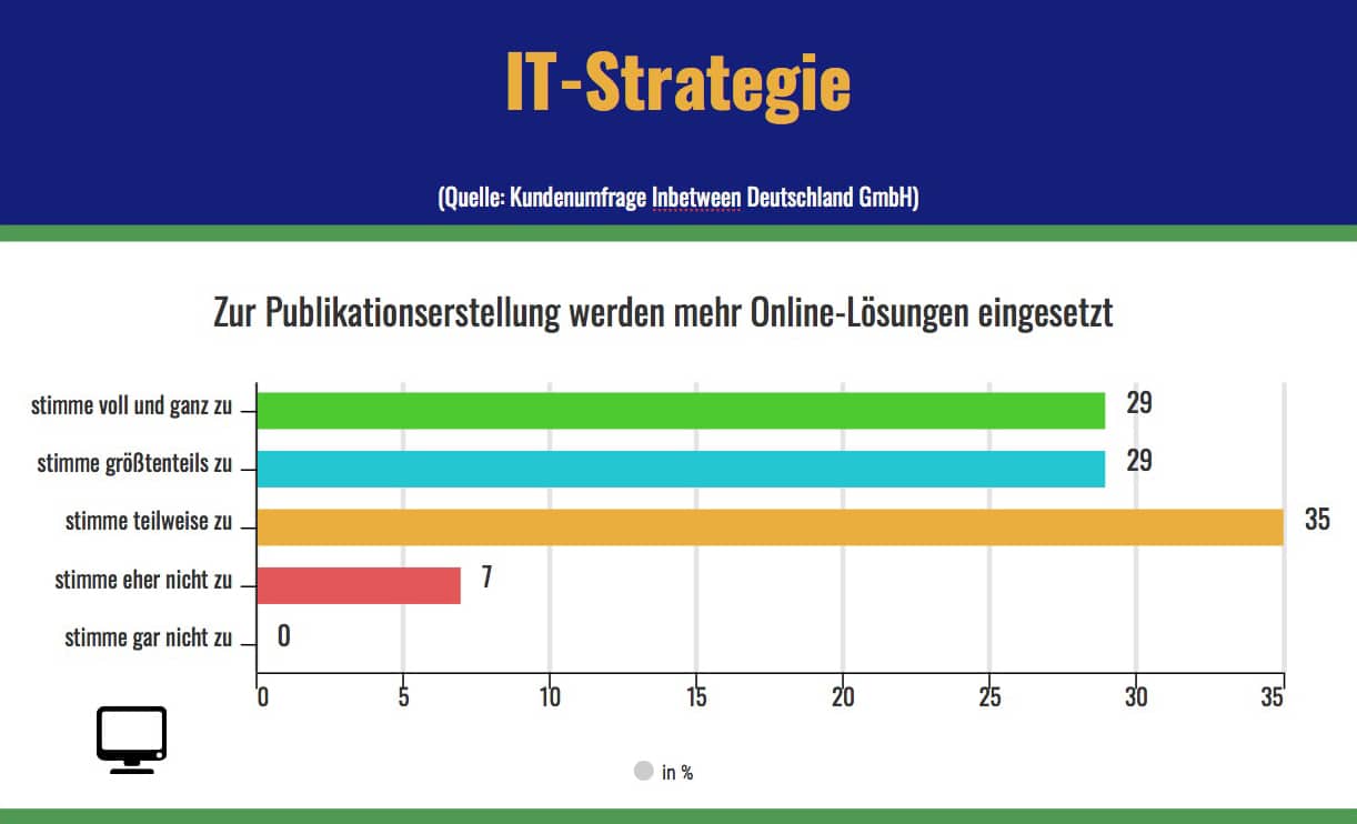 Anfang 2021 hat die Inbetween Deutschland GmbH im Rahmen einer Kundenumfrage versucht herauszufinden, in welche Richtung sich Publikationsprozesse vor dem Hintergrund einer sich ständig und immer schneller verändernden Produktkommunikation weiterentwickeln müssen. Hier lässt sich viel aus dem künftigen Investitionsverhalten sowie der strategischen Ausrichtung der Kunden herauslesen – nicht nur für Inbetween. Aus diesem Grund veröffentlicht die Branchenplattform print.de an dieser Stelle die wichtigsten Ergebnisse der Inbetween-Umfrage in Form eines kompakten Überblicks mit Infografiken. [14647]
