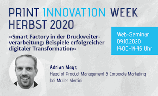 Viele Druckereien und Weiterverarbeitungsbetriebe stehen heute vor der herausfordernden Aufgabe, ihre bisher konventionell geführten Unternehmen für die digitale Welt fit zu machen. Adrian Mayr von Müller Martini zeigt in einem Online-Seminar (Freitag, 9.10., 14:00-14:45 Uhr) anhand von Praxisbeispielen mit Fokus auf die Weiterverarbeitung, wie Ihnen das mit dem richtigen Workflow gelingt. Die dargestellten Lösungen sind auch für konventionelle Drucker und Buchbinder von Interesse, die ebenfalls mit der digitalen Transformation konfrontiert sind.