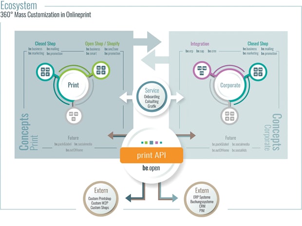 Herzstück von be.print ist die be.open-API, eine neu programmierte Middleware, die als Produktionsschnittstelle Unternehmen und Druckdienstleister miteinander verbindet und den Austausch von Angeboten und Aufträgen auf Basis von Attributen, wie etwa Metadaten, Preise, Lieferzeiten, etc., ermöglichen soll. Sie operiert ähnlich wie eine große Produzentendatenbank, über die nicht nur Unternehmen produktbezogen und unkompliziert den passenden Dienstleister finden können, sondern sich auch Druckereien miteinander vernetzen und Produkte sowie Dienstleistungen anbieten und nutzen können.