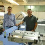 binderhaus-Geschäftsführer Michael Jellinghaus und RCDruck-Geschäftsführer Markus Conzelmann (r.) haben mit der Balkenrillmaschine R50/10 sehr schnell zu einem für beide Seiten gewinnbringenden Geschäftsabschluss gefunden.