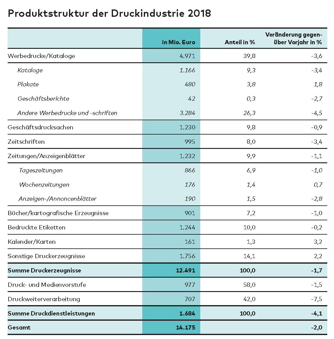 In einigen Bereichen stieg die Produktion, etwa bei Plakaten (+1,8 %, 480 Mio. Euro), Wochenzeitungen (+0,7 %, 176 Mio. Euro), Kalendern und Karten (+3,2 %, 161 Mio. Euro) und nicht auf Papier gedruckten Erzeugnissen (+6,8 %, 559 Mio. Euro). Dagegen nahm die Produktion bei Werbedrucken wie Werbebeilagen und Prospekten (-4,5 %, 3,3 Mrd. Euro), bei Zeitschriften (-3,4 %, 995 Mio. Euro) und Anzeigeblättern (-2,8 %, 190 Mio. Euro) sowie in der Druckweiterverarbeitung (-7,5 %, 707 Mio. Euro) überdurchschnittlich ab.
