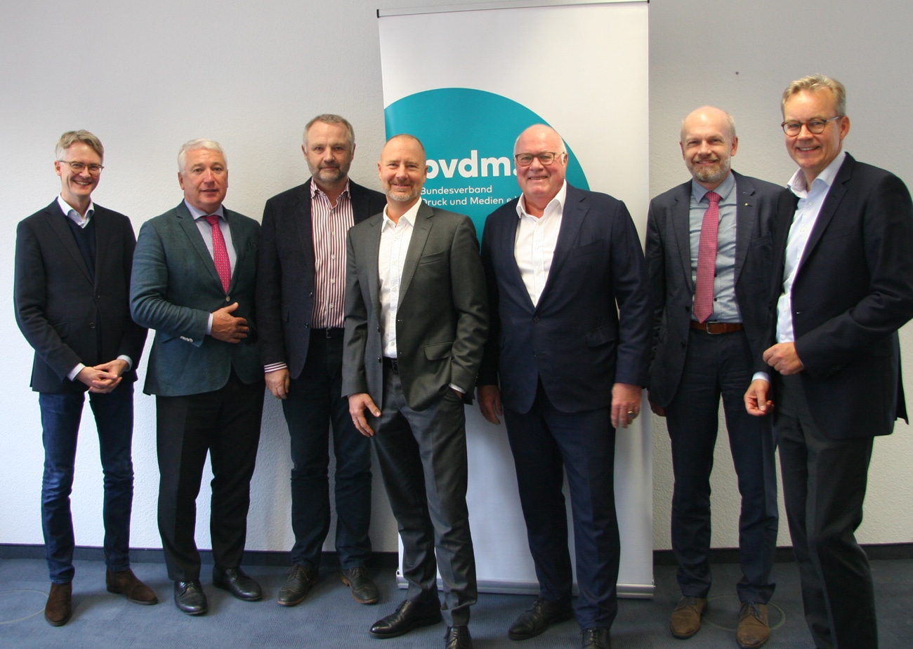 Darüber hinaus setzte sich das Präsidium mit weiteren Zukunftsthemen der Druckbranche auseinander. Der wachsende Fachkräftemangel oder die ungelöste Nachfolgeproblematik in vielen Unternehmen stellten Betriebe wie auch Verbände vor neue Herausforderungen. „Diesen Herausforderungen wollen wir zukünftig durch eine verstärkte Zusammenarbeit von Landesverbänden und Bundesverband kraftvoll begegnen“, fasste Poppen die strategischen Grundsatzüberlegungen zusammen. Deshalb wurde die Zusammensetzung des Präsidiums des bvdm verändert, um zukünftig die gesamte Verbandsorganisation effizienter steuern und schneller auf die Herausforderungen der Branche reagieren zu können. So gehören dem neuen Präsidium neben drei ehrenamtlichen Unternehmern und dem bvdm-Hauptgeschäftsführer drei Geschäftsführer von Landesverbänden an.