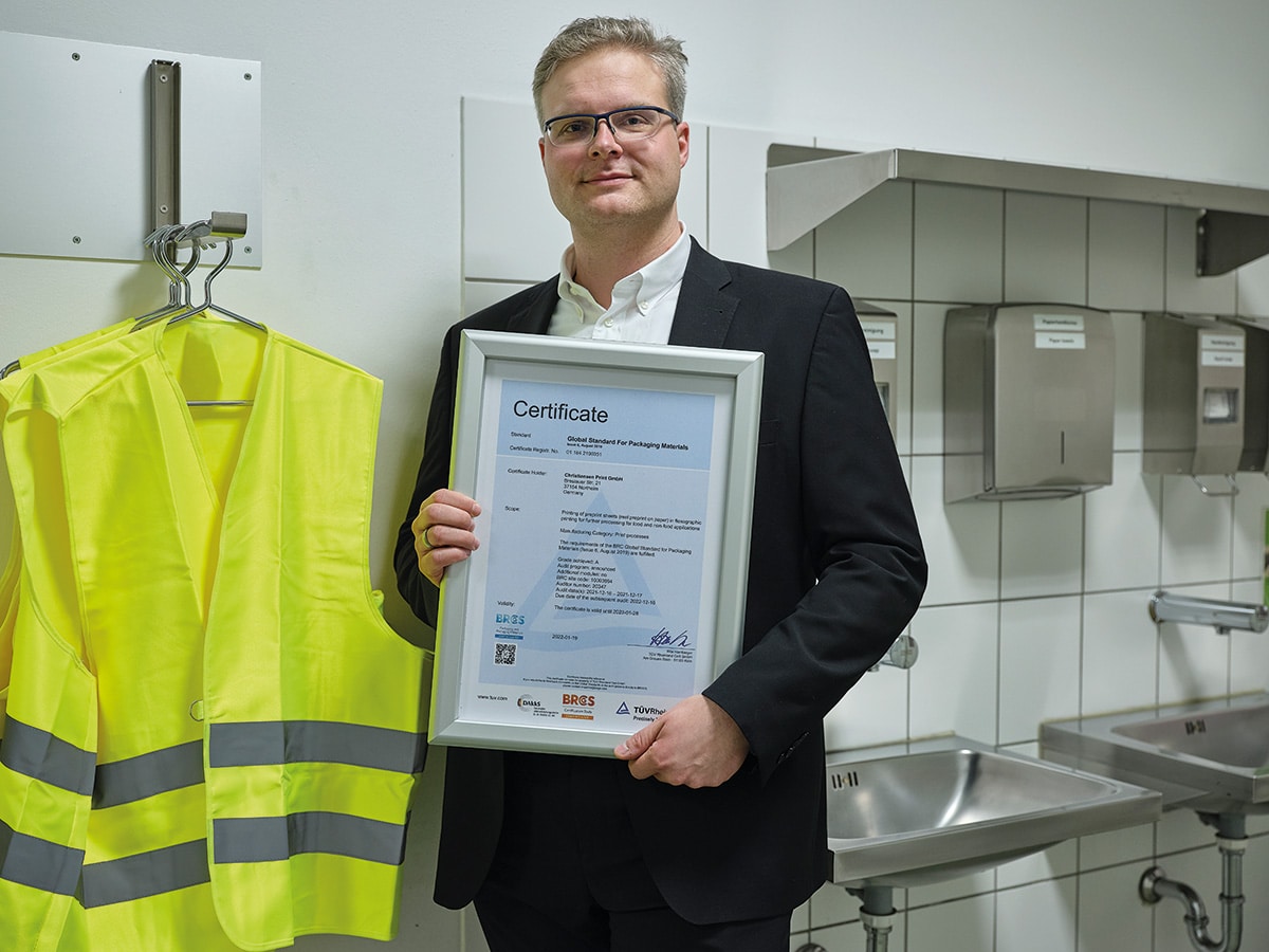 Im Januar 2022 konnte Christiansen Print am Northeimer Standort die Erst-Zertifizierung nach den Globalen Standards für Verpackungen und Verpackungsmaterialien (Brand Reputation through Compliance Global Standard – kurz BRCGS) abschließen. Das Ergebnis: Klasse A – die zweitbeste von fünf möglichen Klassifikationen. Michael Weber, Leiter Corporate Strategie + Marketing erklärt dazu: „Wir stellen damit wichtige Weichen für die Zukunft. Die Nachfrage nach papierbasierten Lösungen für den Lebensmitteldirektkontakt ist merklich angestiegen, nicht zuletzt durch die Änderungen im Verpackungsgesetz.“