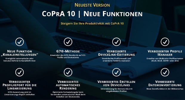 „CoPrA 10“ beschleunigt und verbessert außerdem täglich genutzte Funktionen. Die DeviceLink-Workflows in „CoPrA 10“ wurden im Sinne der Benutzerfreundlichkeit überarbeitet. Das Modul zur Dateikonvertierung verfügt jetzt über eine Zoomfunktion für die Bildvorschau. Außerdem enthält der Profilreport jetzt auch G7-Auswertungsdaten, was die Analyse von Mess- und Berechnungsdaten verbessern soll.