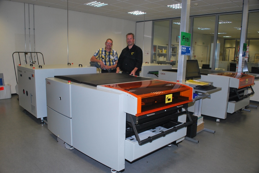 Zwei CtP-Systeme des chinesischen Herstellers Cron bebildern pro Jahr 16.000 bis 20.000 Druckplatten für den Bogen- und Rollendruck bei der Faubel & Co. Nachfolger GmbH. Thorsten Ott vom Fachhändler Beta GmbH (links) und Jens Pöppe, Abteilungsleiter Prepress bei Faubel, arbeiten partnerschaftlich zusammen.