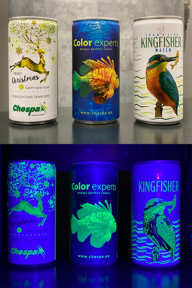 In Diskotheken und Clubs sehr gefragt: Mit fluoreszierenden Farben und Lacken bedruckte Getränkedosen, die unter Schwarzlicht zu leuchten beginnen. Auch diese Farben entwickelte die Online-Druckerei zusammen mit Chespa. (Bild: Design your Drink GmbH)