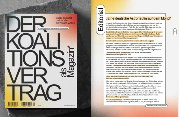 Die Idee hinter dem “Der Koalitionsvertrag als Magazin” geht laut Oliver Wurm auf ein Zitat von Markus Söder zurück, der auf einer gemeinsamen Pressekonferenz von Union und SPD am 9. April gesagt hatte: „Diesen Koalitionsvertrag empfehle ich übrigens genau zu lesen, von jedem Einzelnen. Er kann ein kleiner Bestseller werden, denn jeder Satz ist Politik pur.” Da aber die ursprünglich 146 Seiten des Vertrags selbst für versierte Leser nur schwer zu konsumieren sind und somit kaum zum Bestseller taugen, sah sich Wurm herausgefordert. Entsprechend lautet die Fußnote zum Magazin-Titel: “lesbar gestaltet und für alle, die Wissen wollen.”