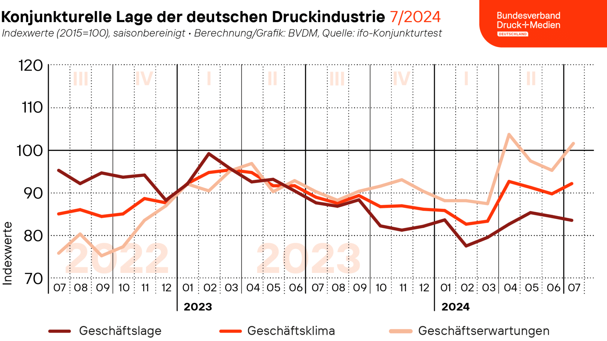 Nach dem leichten Rückgang im Juni verbesserte sich die Stimmung der Unternehmen in deutschen Druck- und Medienwirtschaft im Juli 2024 etwas. Der vom Bundesverband Druck und Medien berechnete Geschäftsklimaindex verzeichnete saison- und kalenderbereinigt rund 2,6 Prozent über dem Vormonatswert. Mit 92,4 Punkten notierte der Index im Juli damit rund 3,5 Prozent über seinem Vorjahresniveau. Maßgeblich bestimmt wurde die Verbesserung des Geschäftsklimas durch den Anstieg der Geschäftserwartungen, während der Geschäftslageindex hingegen den zweiten Monat in Folge nachgab.