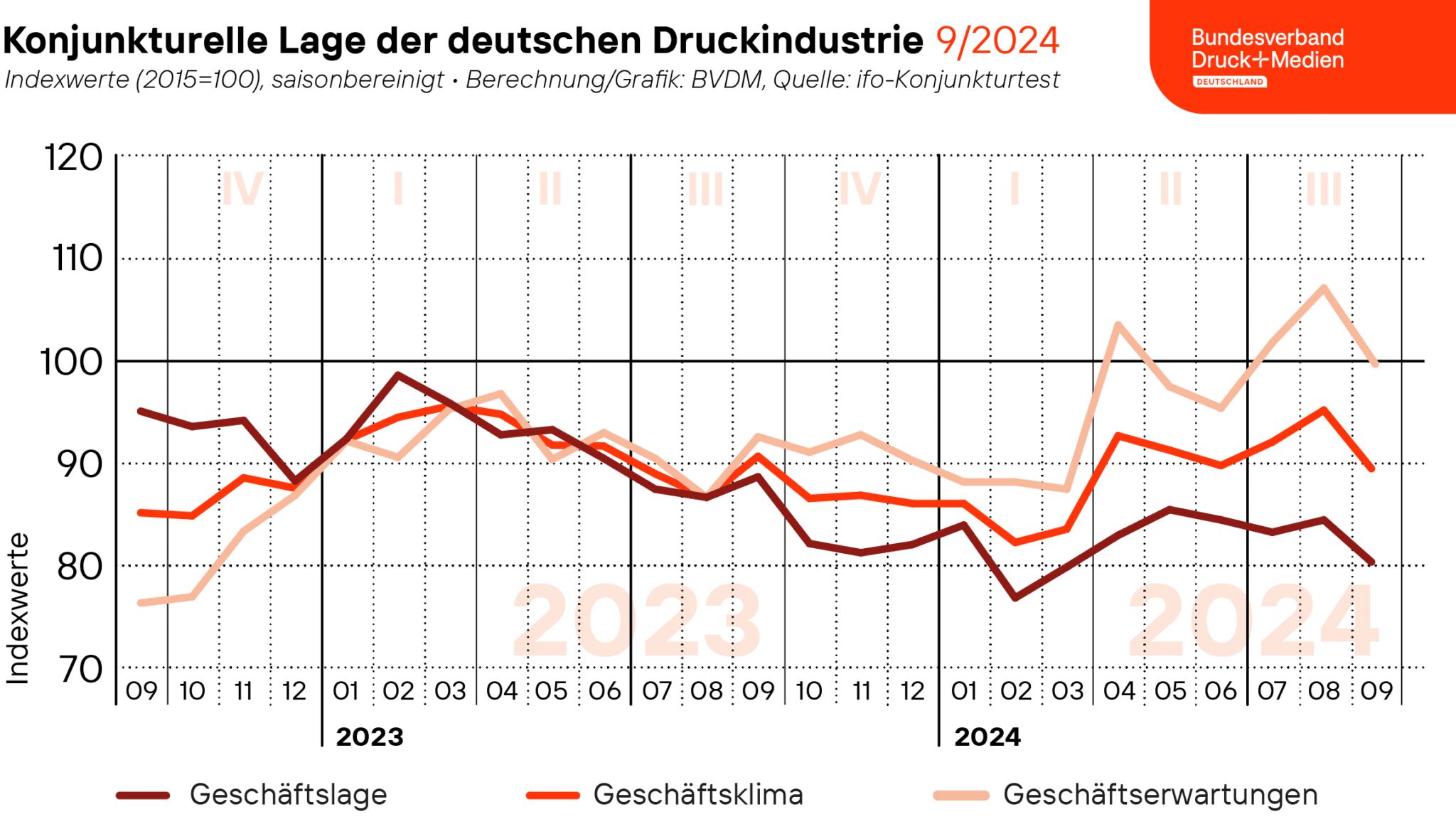 Nach der positiven Entwicklung im August verschlechterte sich die Stimmung der Unternehmen in der deutschen Druck- und Medienwirtschaft im September 2024. Der vom Bundesverband Druck und Medien ermittelte Geschäftsklimaindex verzeichnete mit einem saison- und kalenderbereinigten Minus von rund 5,9 Prozent den stärksten Vormonatsverlust in diesem Jahr. Mit 89,7 Punkten notierte der Index im September damit erneut rund 1,2 Prozent unter seinem Vorjahresniveau. Maßgeblich bestimmt wurde die Entwicklung sowohl durch eine Eintrübung der aktuellen Geschäftslage als auch durch einen deutlichen Rückgang der Geschäftsaussichten.