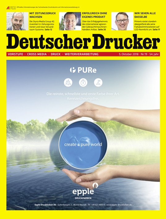 Das neue Öko-Farbsystem Pure von Epple Druckfarben soll mehrere Eigenschaften kombinieren, darunter eine kennzeichnungsfreie Rezeptur, schnelle, geruchsneutrale Verarbeitung – auch auf Naturpapieren – sowie gute Deinkbarkeit. Doch wie läuft das Farbsystem in der Druckmaschine? Welches sind die charakteristischen Merkmale und besonderen Eigenschaften der Bogenoffset-Druckfarbe? Mehr über die Möglichkeiten dieses Farbsystems lesen Sie in DD 19/2018.