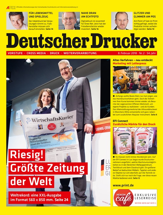 Einen Weltrekord hat der Berliner Tagesspiegel aufgestellt. Zum 60. Geburtstag hat das Blatt eine Zeitungsausgabe im Format 560 x 850 mm herausgebracht. Definitiv XXL und definitiv die größte Zeitung der Welt. Einen weiteren Weltrekord hat nach eigenen Anganen die Koenig & Bauer AG bei ihren Innovation Days 2017 aufgestellt. So wurde in Radebeul die Rotationsstanze Rapida PDC 106 mit einer Leistung von 17.000 Bogen/h vorgeführt. Ebenso zeigte der Druckmaschinenhersteller seine neuesten Entwicklungen im Bereich autonomes Drucken. Demnach ist die sich selbst programmierende Druckmaschine keine Vision mehr. Wie genau das funktioniert, lesen Sie im nächsten Heft.