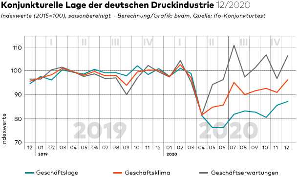 Nachdem sich das Geschäftsklima der deutschen Druck- und Medienbranche im November leicht abgekühlt hatte, hellte es sich im Dezember wieder sichtlich auf. Der vom Bundesverband Druck und Medien berechnete Geschäftsklimaindex stieg im Vergleich zum Vormonat um saisonbereinigt 5,8 Prozent. Mit 96,4 Punkten erreichte der Index den höchsten Wert seit neun Monaten und notiert mittlerweile nur noch 4 Prozent unter seinem Vorjahresniveau. Doch auch wenn die Unternehmen den Teil-Lockdown relativ gut verkraftet haben, dürfte der Mitte Dezember angeordnete harte Lockdown deutliche Auswirkungen haben.