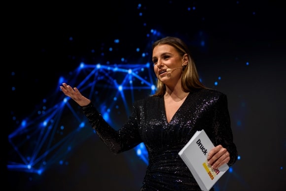 Laura Wontorra (l.) begeisterte im Vorjahr die Gäste der Gala der Druck&Medien Awards – sie wird auch in 2024 die Jubiläums-Gala moderieren.(Bild: Andreas Schwarz)