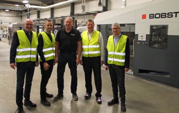 Kunde und Lieferant: Stefan Gausepohl (zweiter von rechts) und Christian Wala (links neben ihm) mit Olivier Portal, bei Bobst Lyon Technology Sales Manager für Deutschland und die Schweiz (zweiter von links), Norbert Klein, Verkauf Bobst Meerbusch (ganz links), und Tomasz Nieborek, bei Bobst Mex Regional Marketing & Communications Manager für DACH (ganz rechts).