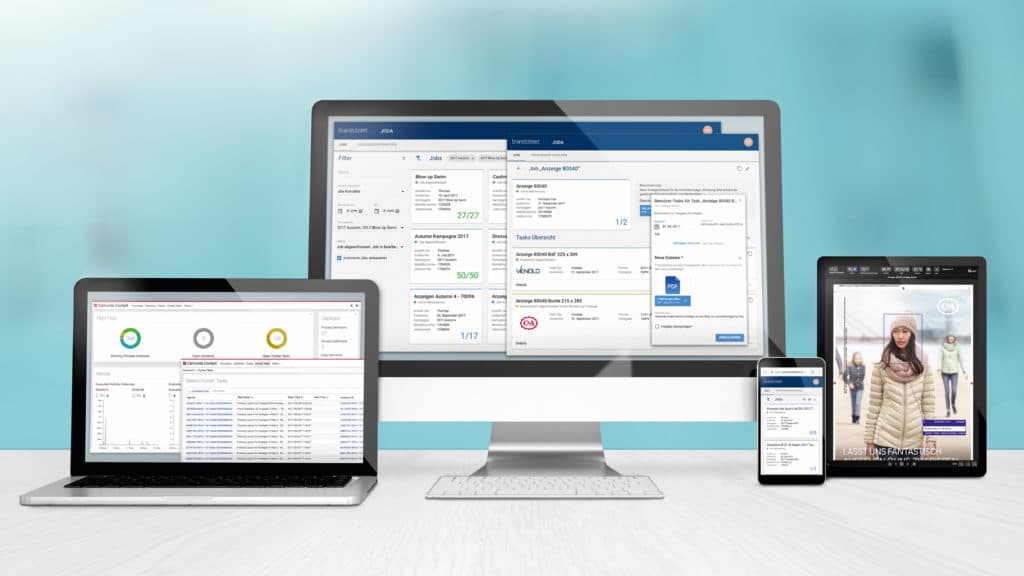 Auf dieser Basis und vor dem Hintergrund, die Möglichkeiten von Industrie 4.0 auf die Bedürfnisse eines Agentur- und Medienproduktionsbetriebs zu transferieren, entstand in Ratingen ein vollständig digitaler Workflow, der vom Auftrag des Kunden über die Produktion und Datenauslieferung bis hin zur Rechnungsstellung den kompletten Produktionsablauf abbildet. Die Mitarbeiter arbeiten systemgesteuert, die Aufgabenverteilung wird zentral über eine Workflow-Engine verwaltet und gesteuert. Process-Engines ermöglichen standardisierte und trotzdem kundenindividuell zusammenstellbare Abläufe im Produktionsprozess – mit Tools für Approvalzyklen, zur Jobstatus- und Sendungsverfolgung etc. Grundlage hierfür bilden die Modellierungssprachen BPMN 2.0 für lineare und CMMN für fallbezogene Abläufe, wie sie etwa in Großkonzernen der Versicherungs- oder Telekommunikationsbranche zum Einsatz kommen, um eine feingranulare Steuerung dieser Prozesse zu gewährleisten. Die Engines greifen auf die internen und externen Prozesse (mit der Bereitstellung von Werkzeugen und Schnittstellen) zu, die zuvor kontinuierlich erfasst, analysiert und in möglichst detaillierte Fragmente aufgeteilt wurden. Sie entstanden in Zusammenarbeit mit dem Technologiepartner und „Kernprozessautomatisierer“ Camunda Services GmbH aus Berlin.