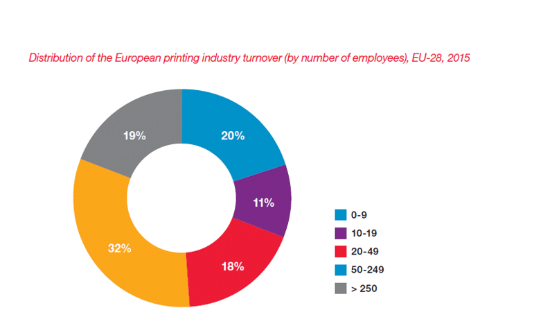 89% der europäischen Druckfirmen die weniger als 10 Mitarbeiter haben, generieren 19% des gesamten Umsatzes der europäischen Druckindustrie. Weniger als 1% der europäischen Druckfirmen, die mehr als 250 Mitarbeiter haben, generieren 19% des Umsatzes. Die Hälfte des Gesamtumsatzes wird von Firmen generiert mit weniger als 20 Angestellten. Die andere Hälfte wird von Firmen generiert die mehr als 20 Angestellte haben.