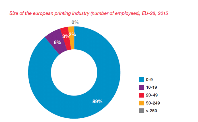 In der europäischen Druckindustrie haben 89% der Firmen weniger als 10 Angestellte. Weniger als 1% stellen mehr als 250 Mitarbeiter ein. Das sind etwa 90 Firmen in der EU.