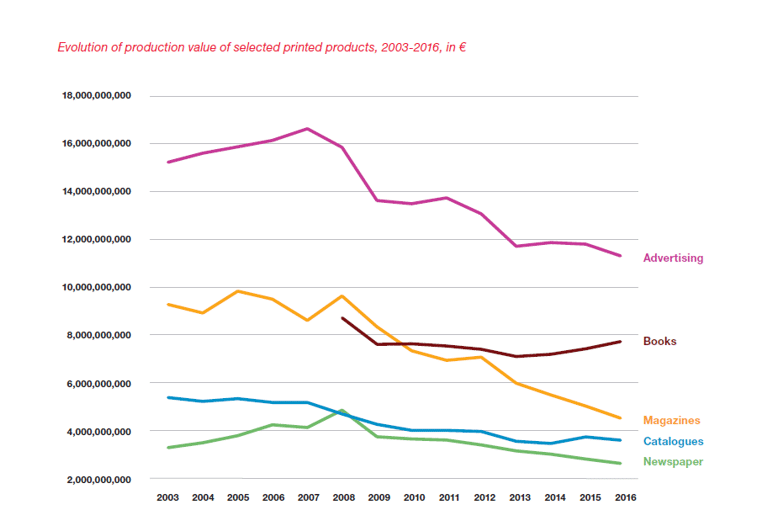Wenn man 2008 als Referenz nimmt, dann fiel die Zahl der Magazinprodukte um 52.7%, Zeitungen um 45.2%, Werbung um 28.4%, Kataloge um 22.7% und Bücher um 11.1%. Bücher sind im Jahr 2016 die einzige Kategorie, wo die Produktion im Vergleich zu 2015 zugenommen hat (um 3.7%).