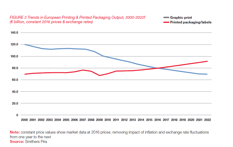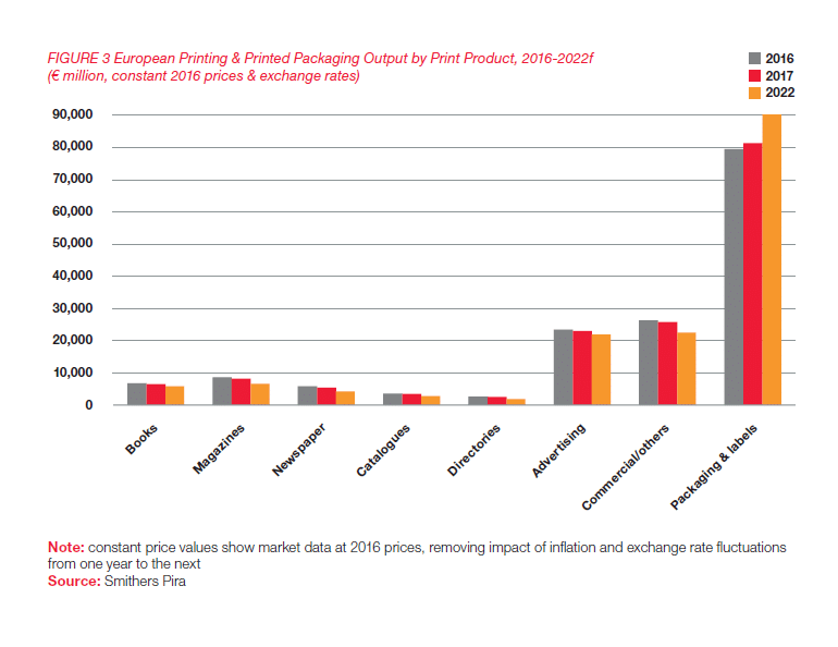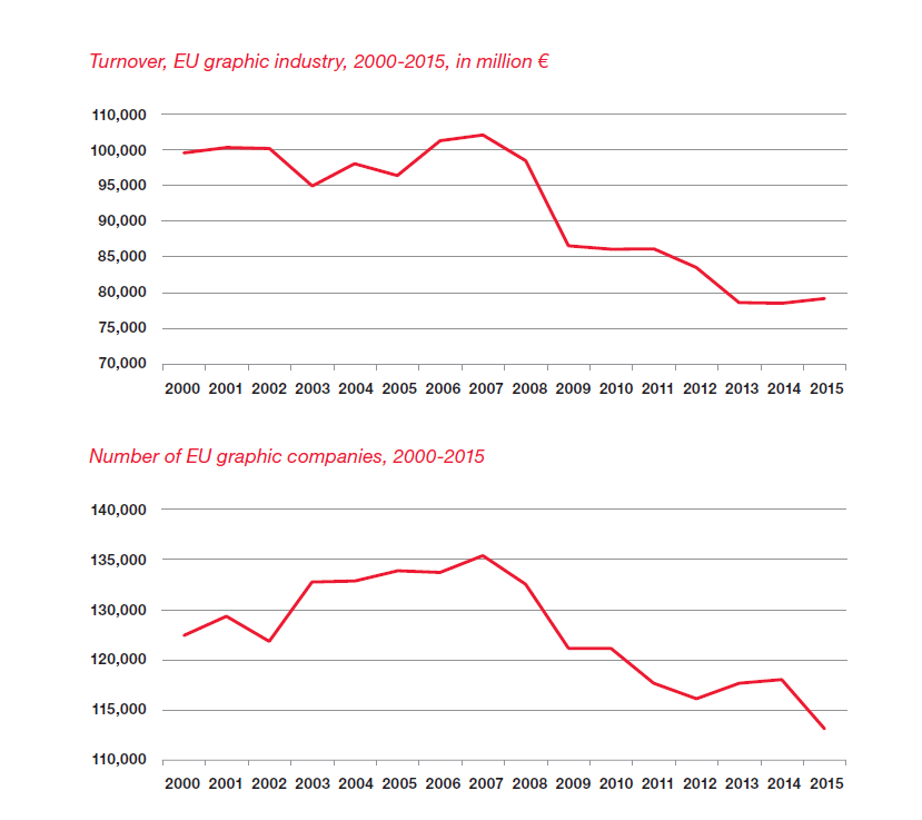 Im Jahr 2015 zählte die europäische Druckindustrie mehr als 110.000 Firmen, die insgesamt einen Umsatz von 80 Milliarde € erwirtschaftete. Über den Zeitraum von 10 Jahren (2005 bis 2015) ist der Umsatz um 20% gesunken und die Zahl der Firmen fiel um 14%.