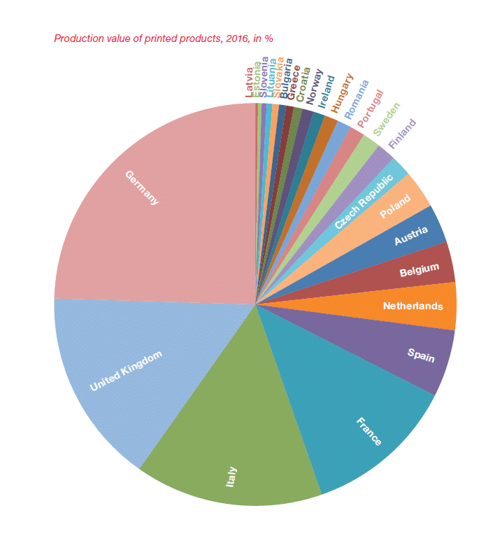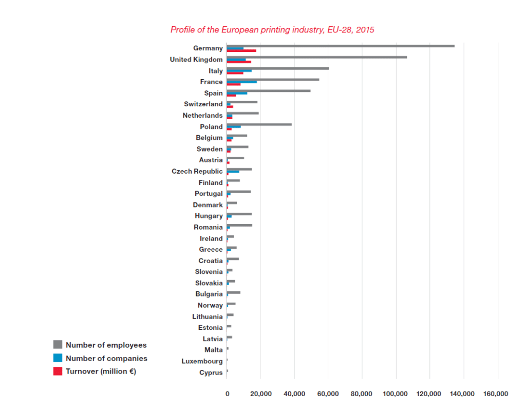 Deutschland, UK und Italien konnten im Jahr 2015 den höchsten Umsatz erwirtschaften und verzeichnen auch die höchste Anzahl an Angestellten in Europa. Nichtsdestotrotz verzeichnen Frankreich, Italien und Spanien die höchste Anzahl an Druckfirmen in Europa.