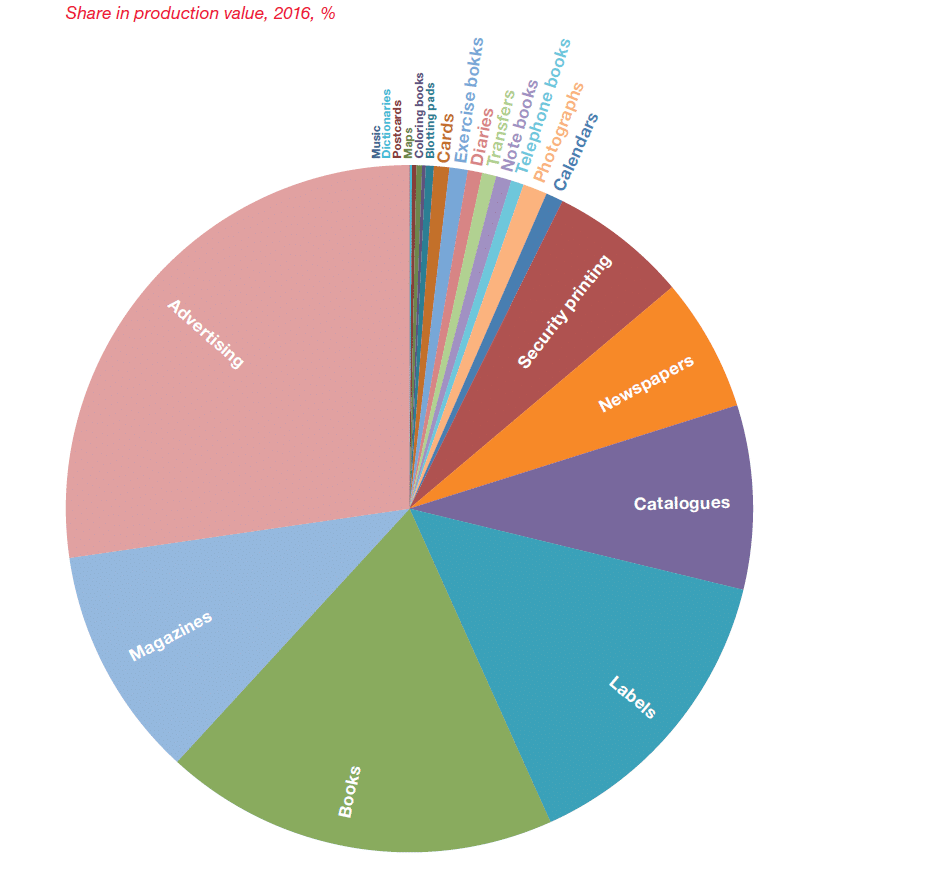 Im Jahr 2016 wurden gedruckte Produkte im Wert von rund 53 Milliarden Euro produziert. 27% der gedruckten Produkte sind Werbung, das macht etwa 11.3 Milliarde Euro aus. Kataloge liegen bei 8.7%. Magazine und Zeitungen machen 10.9% (4.5 Milliarde €) und 6.3% (2.6 Milliarde Euro) aus.