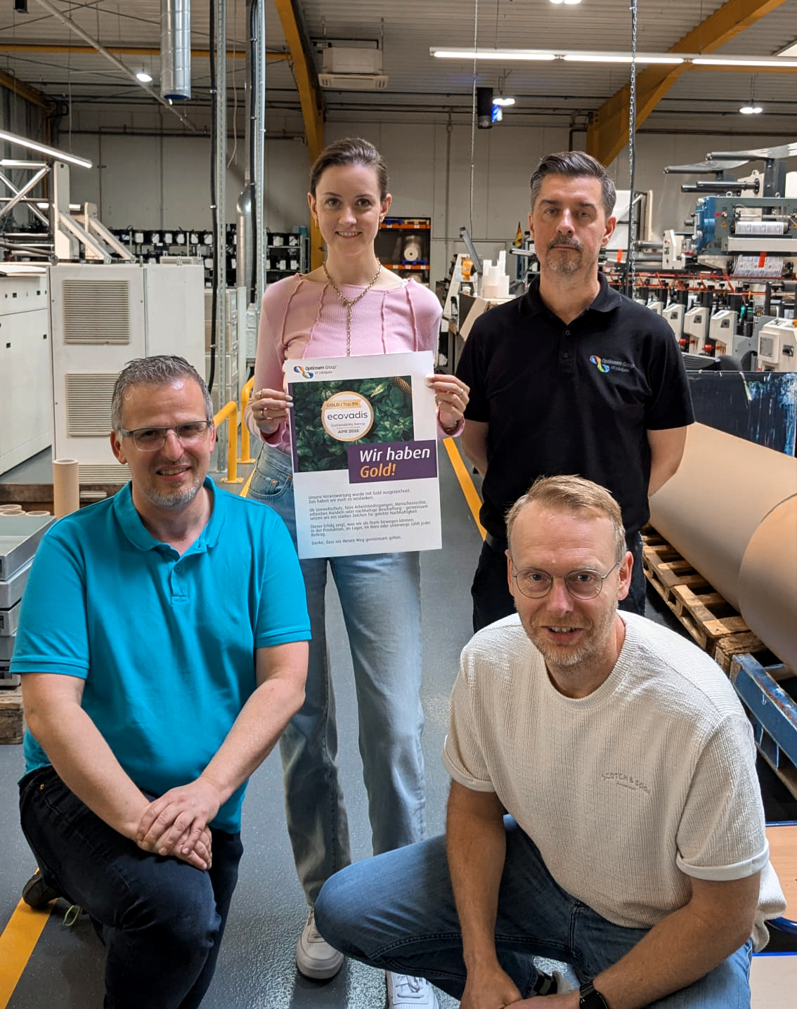 Jens Mohr (li.), als QSHE-Manager der Optimum Group Germany zuständig für alle deutschen Standorte, freut sich zusammen mit Mitarbeitern von HT Labelprint in Salzbergen über die EcoVadis-Gold-Auszeichnung: (v.l.n.r) Alicia Striet (Vertriebsinnendienst), Thomas Smolka (Produktionsleitung) und Dennis Möller (Vertriebsinnendienst).(Bild: Optimum Group)