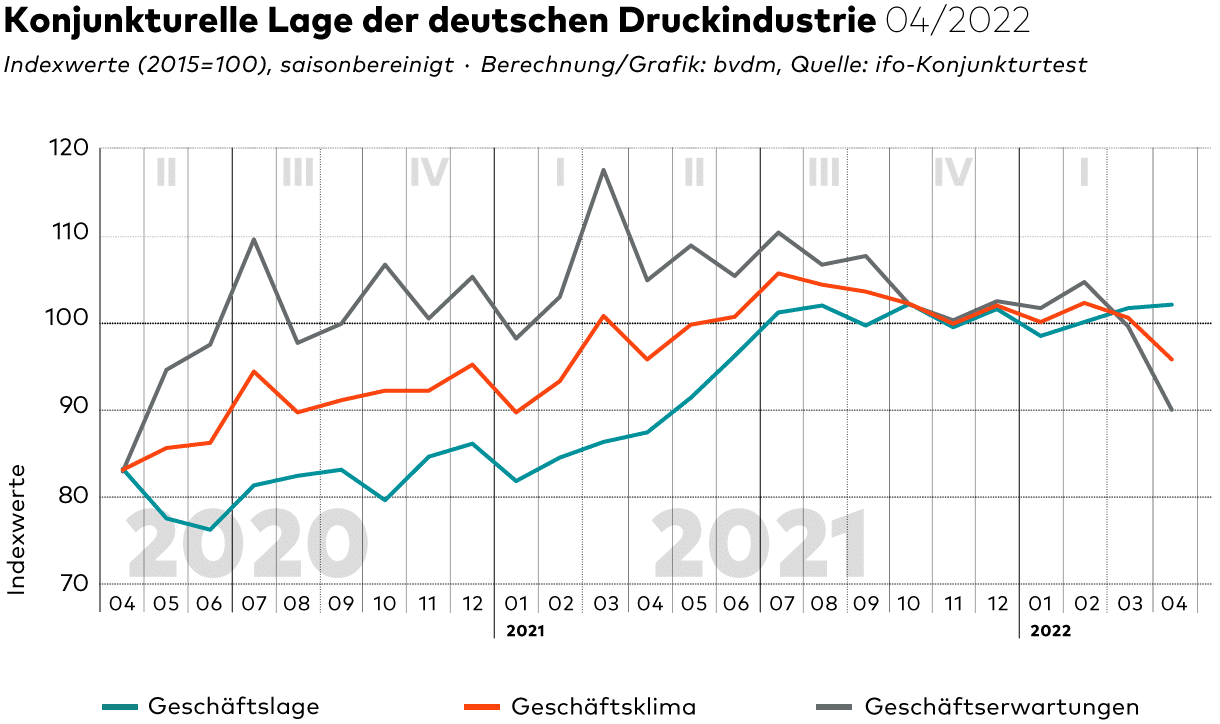 Die Auswirkungen des Ukrainekriegs beherrschen die erwartete Geschäftsentwicklung der Druck- und Medienunternehmen der nächsten 6 Monate weiterhin gravierend. Der Index der Geschäftserwartungen verlor im April 8,7 Prozent und verstärkte damit seine Abwärtsbewegung aus dem März weiter. Mit 90,0 Punkten notiert der saisonbereinigte Index rund 16 % unter seinem Vorjahresniveau und befindet sich nur noch rund 6,7 % über seinem Corona-Tiefststand vom April 2020. Dies beziffert den stärksten Rückgang im Vorjahresvergleich seit dem Ausbruch der Coronakrise.