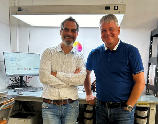 Frank Neumann, Geschäftsführer der Achertäler Druckerei (re.), mit Uli Höfler, der für Zeller+Gmelin den Bereich Verpackungs- und Etikettendruck in Süddeutschland betreut.