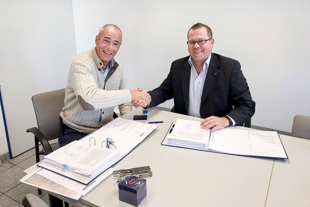 Kurz nach der Vertragsunterzeichnung: Gerhard Tapken (l.), Eigentümer Druckhaus Delmenhorst, und Günter Noll, Vertriebsleiter Koenig & Bauer Digital & Webfed. (Bild: Koenig & Bauer)