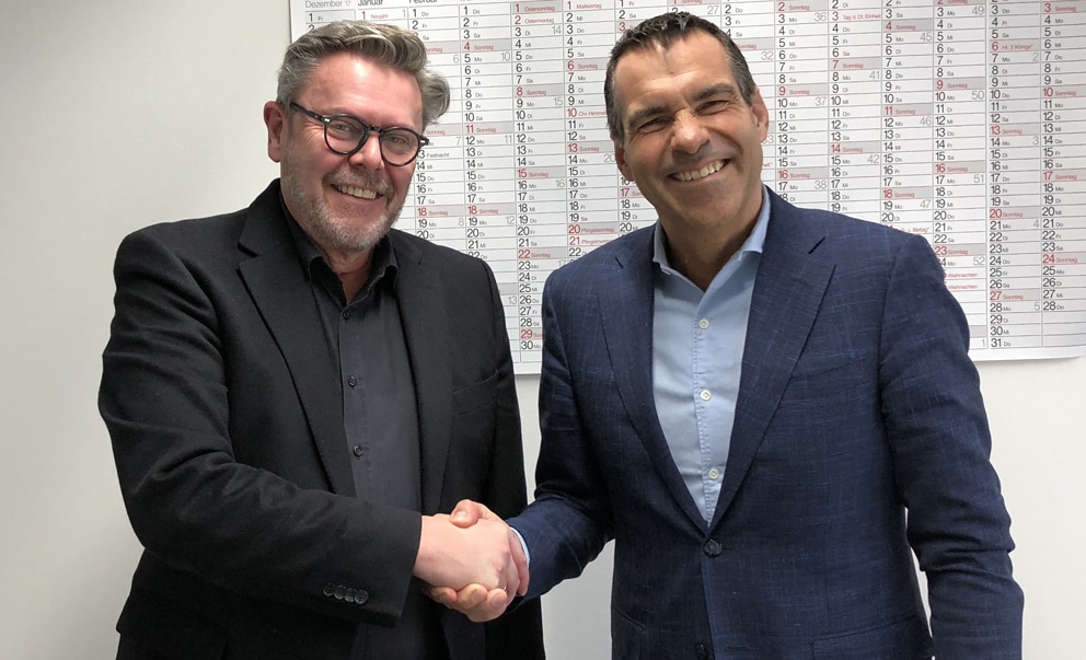 Das Druckhaus Ulm-Oberschwaben (li. Geschäftsführer Ernst Jackwert) investiert in Technik von Q.I. Press Controls. Re.: Menno Jansen, Chairman QIPC.(Bild: QIPC)