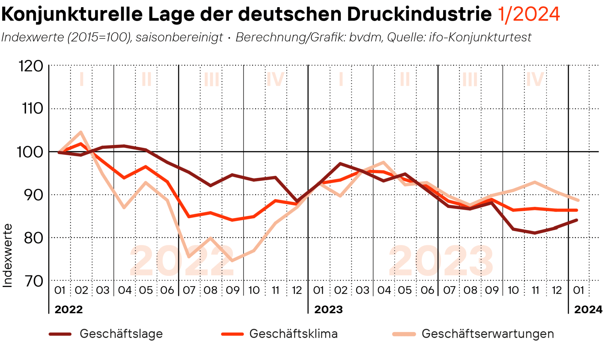 Zum Beginn des Jahres 2024 blieb das saison- und kalenderbereinigte Geschäftsklima der deutschen Druck- und Medienwirtschaft unverändert. Während die Geschäftsaussichten für die nächsten 6 Monate leicht rückläufig waren, stiegen die Einschätzungen hinsichtlich der aktuellen Geschäftslage leicht an.(Bild: bvdm)