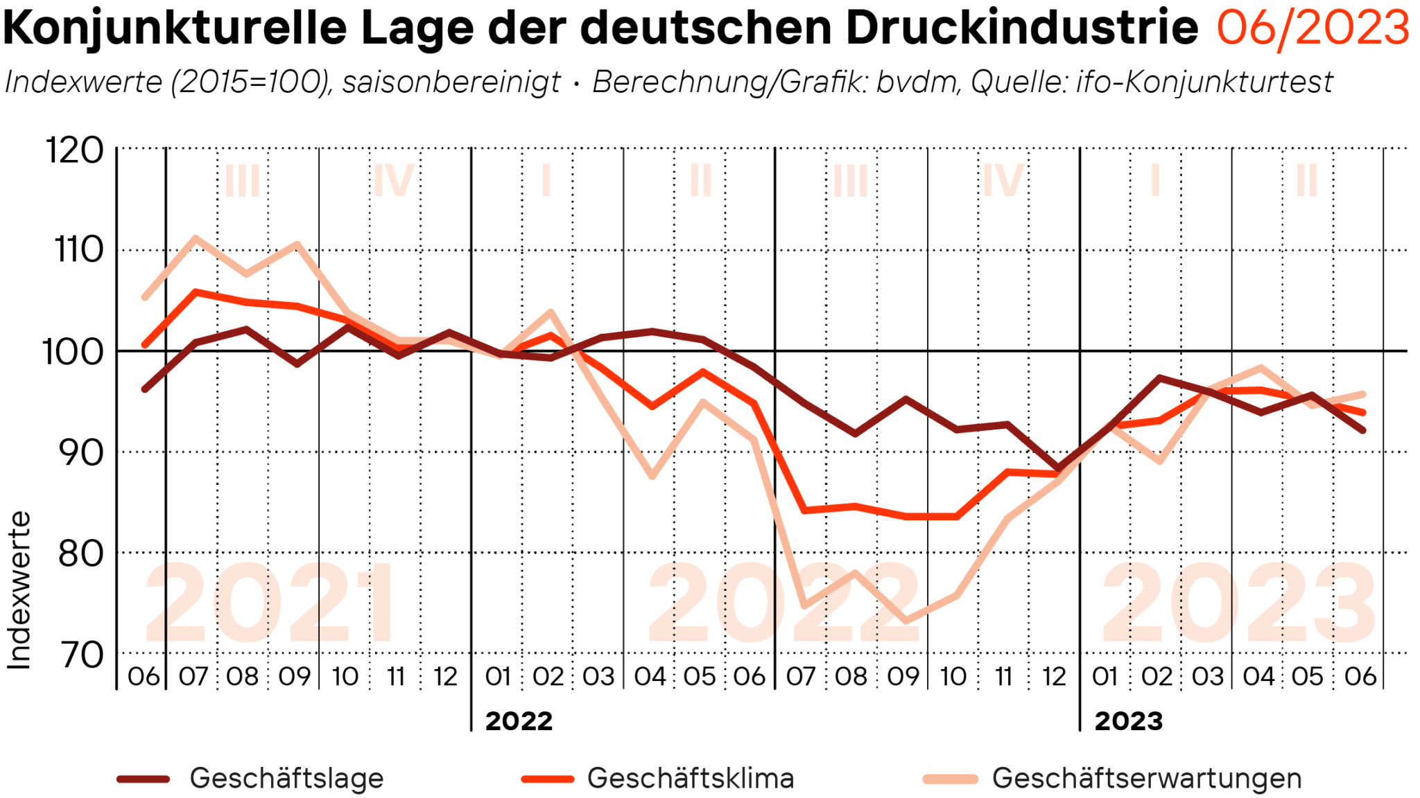 Im Juni 2023 sank das saison- und kalenderbereinigte Geschäftsklima der deutschen Druck- und Medienwirtschaft erneut leicht, die sinkende Geschäftslageeinschätzung bestimmte dabei maßgeblich die Entwicklung. Der vom Bundesverband Druck und Medien berechnete Geschäftsklimaindex verlor saisonbereinigt 1,3 Prozent im Vergleich zum Vormonatsniveau. Mit 94,1 Punkten notierte der Index damit rund 0,9 Prozent unter dem vom Ukrainekrieg geprägten Vorjahresniveau.