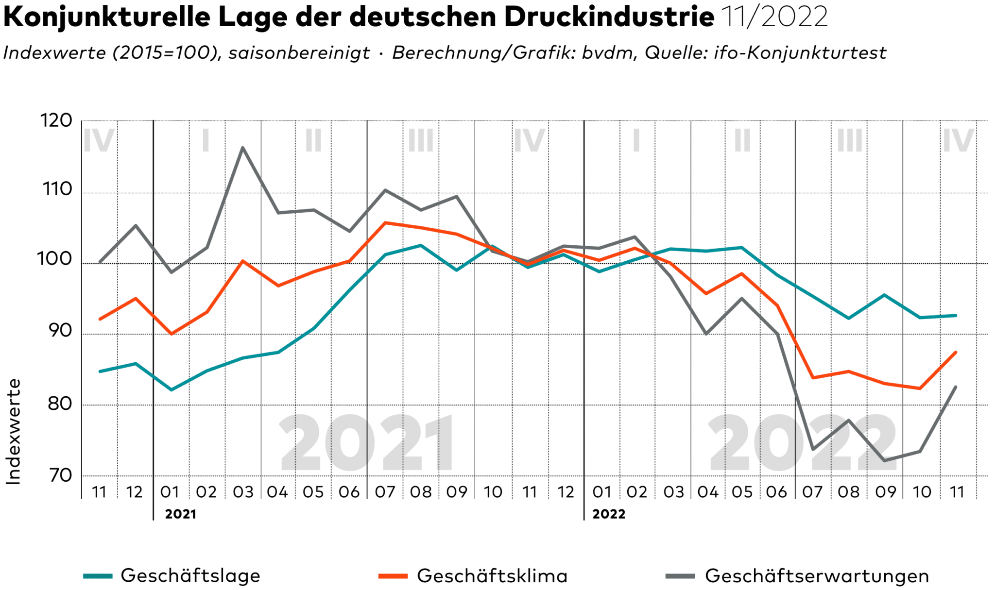 Die Erwartungen der Unternehmen in der Druck- und Medienbranche sind auch weiterhin von den erwarteten Entwicklungen an den Beschaffungsmärkten und der Gesamtkonjunktur geprägt. Diese verbesserten sich leicht – unter anderem durch die partielle Entspannung an den Energiemärkten sowie die von der Bundesregierung angekündigten Preisbremsen für Strom und Gas.