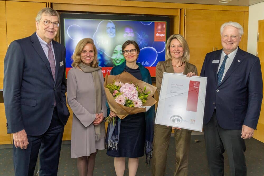 Der mit 6.000 Euro dotierte Drupa-Preis wurde gestern von Erhard Wienkamp (Geschäftsführer Messe Düsseldorf), Dr. Andreas Pleßke (Vorstandsvorsitzender/CEO Koenig & Bauer und Vorsitzender des drupa Komitees), Prof. Dr. Anja Steinbeck (Rektorin der Heinrich-Heine-Universität Düsseldorf), Prof. Dr. Roger Lüdeke (Prodekan der Philosophischen Fakultät der Heinrich-Heine-Universität Düsseldorf) und Doktormutter Prof. Dr. Efrat Gal-Ed während der Messe an die Preisträgerin überreicht.