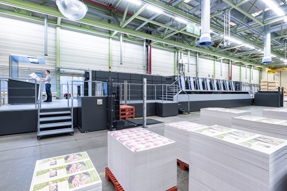 Personalkapazitäten werden zudem dadurch entlastet, dass in Produktionsclustern weniger Personal dieselbe Menge an Maschinen effizient betreiben kann. In Verbindung mit der vollautomatischen Druckplattenlogistik Plate-to-Unit lassen sich bis zu einer kompletten Hilfskraft einsparen und zugleich bis zu 150 Druckplatten pro Stunde automatisiert handeln. In der Weiterverarbeitung entlasten etablierte und neue Robotik-Lösungen.