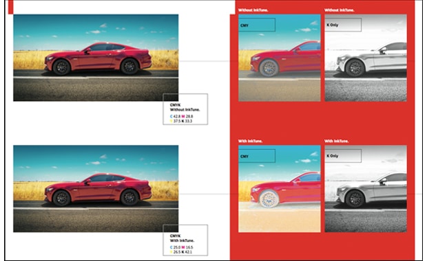 »InkTune« baut auf der Technologie des Unbuntaufbaus (Grey Component Replacement, GCR) auf und ersetzt CMY-Druckfarben dynamisch durch schwarze Druckfarbe. Als intuitive Softwarelösung, die nahtlos in den Druckvorstufen-Workflow integrierbar sein soll, verwendet »InkTune« Technologien von Agfa – die dynamische Farbbegrenzungssteuerung (Dynamic Ink Limit Control) sowie die dynamische Verknüpfung mit Geräteprofilen (Dynamic Device Link Generation). Damit soll eine Einsparung von Druckfarbe um bis zu 30% erreicht werden – unter gleichzeitiger Einhaltung der Farbwiedergabe. Die Farbeinsparung wirke sich jedoch nicht nur positiv auf die Kosten aus, so Agfa Graphics, sondern erhöhe gleichzeitig auch die allgemeine Produktionseffizienz, da die Trocknungszeit verringert werde. Des Weiteren erhöhe sich die Qualität, da Rosettenstrukturen verschwinden und Farbabweichungen weniger sichtbar würden.