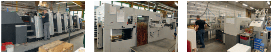 Für die Produktion von der Rolle stehen drei Generationen an Gallus-Maschinen zur Verfügung: die neue Gallus Labelmaster (l.), die Gallus R 160 und die Gallus T 330 S. Buch-, Flexo- und Siebdruckanwendungen sind damit möglich.
