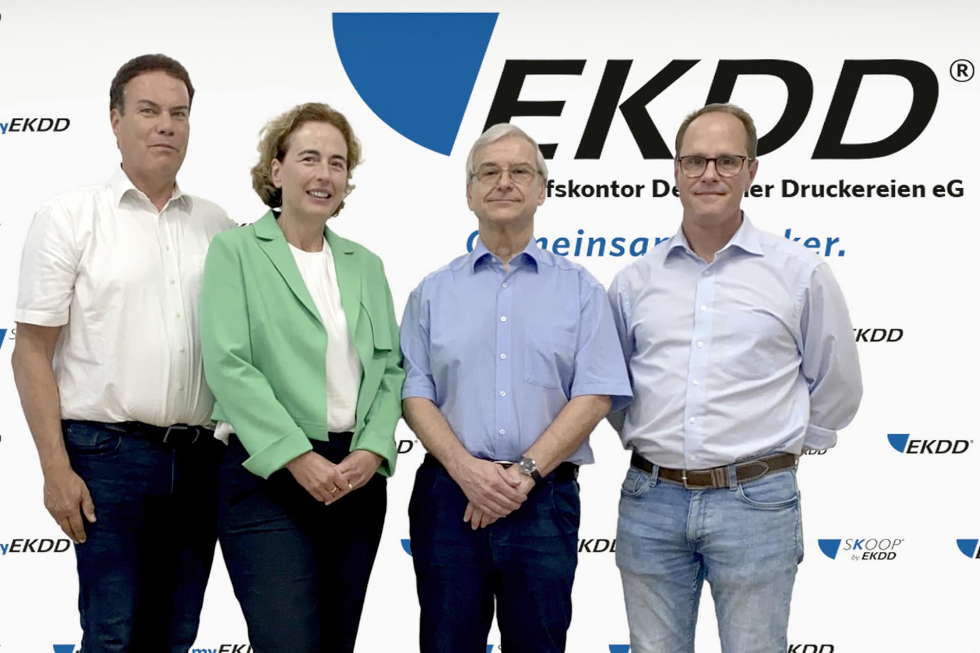 Die beiden Vorstände der EKDD eG, Bodo F. Schmischke (Sprecher) und Delphine A. Soulard, mit Holger Hengst (stv. Aufsichtsrats-Vorsitzender) und Aufsichtsrat Andreas Krych (v.l.n.r.).(Bild: EKDD)