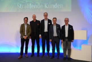 Beim Spatenstich (v.l.n.r.): Hans-Peter Müller (ATP Gesamtplanung), Heiko Engelhardt (Geschäftsführer Burda Druck), Dr. Paul-Bernhard Kallen (Vorstandsvorsitzender Hubert Burda Media), Marco Steffens (Oberbürgermeister der Stadt Offenburg), Sylvia Weisser (Projektleiterin Burda Druck), Thorsten Jung (Geschäftsleitung Baufirma Lang). (Bild: Iris Rothe für Hubert Burda Media)