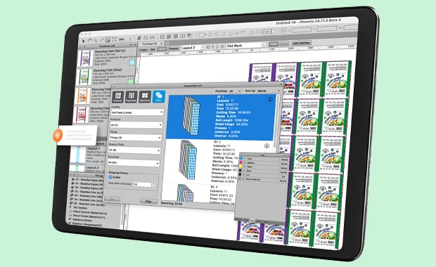 Mit intelligenten Algorithmen für Bogenlayout, Kalkulation und Planung ist Phoenix eine KI-gesteuerte Vorproduktionssoftware der Branche für Kunden aus den Bereichen Verpackung, Etiketten, Akzidenz- und Großformatdruck. James Mason, General Manager für Print Optimization & Planning bei Esko: „Phoenix führt auf Knopfdruck eine Produktionskalkulation, eine KI-Analyse des Designs und der für den Auftrag benötigten Ausrüstung durch und berechnet dann die effizienteste Methode zur Produktion dieser Menge. Dabei werden Faktoren wie die Anzahl der Etiketten pro Rolle, die Verfügbarkeit der Ausrüstung, der Vergleich von Substraten mit mehreren Rollenbreiten, Druckfarben und Folien berücksichtigt. Es ist sogar möglich, anzugeben, ob Spleißungen erlaubt sind und wenn ja, wie viele Spleißungen pro Rolle als akzeptabel gelten.“