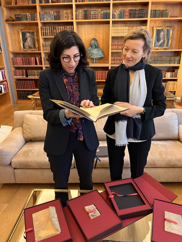 Charlotte Kramer hat der Kulturministerin Frankreichs, Rima Abdul Malak das erste Exemplar der Faksimile-Edition der Notizbücher von Leonardo da Vinci überreicht.(Bild: Mathieu Fournet)