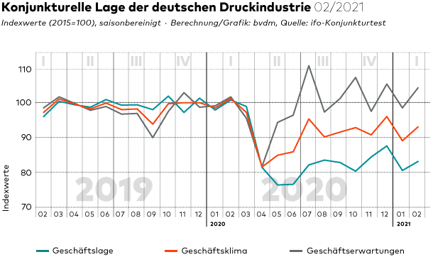 Nachdem sich das Geschäftsklima in der deutschen Druck- und Medienbranche im Januar stark eingetrübt hatte, hellte es sich im Februar wieder auf. Der vom Bundesverband Druck und Medien berechnete Geschäftsklimaindex legte gegenüber dem Vormonat um saisonbereinigt 4,5 Prozent auf 93,2 Punkte zu. Für die jüngste Besserung dürften vor allem hoffnungsvolle Erwartungen bezüglich einer baldigen Lockerung der derzeitigen Corona-Maßnahmen verantwortlich sein. Dennoch notiert der Index immer noch deutlich unter seinem Vorjahresniveau – das Minus beträgt 8,1 Prozent.