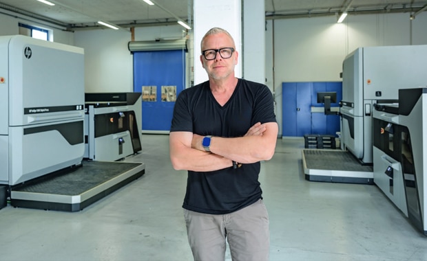 Flyerline-Firmengründer Steffen Tomasi und seine beiden HP Indigo 100K, die zum Jahresende 2024 auf HP Indigo 120K aufgerüstet werden. (Bild: Ulrike Sommer)
