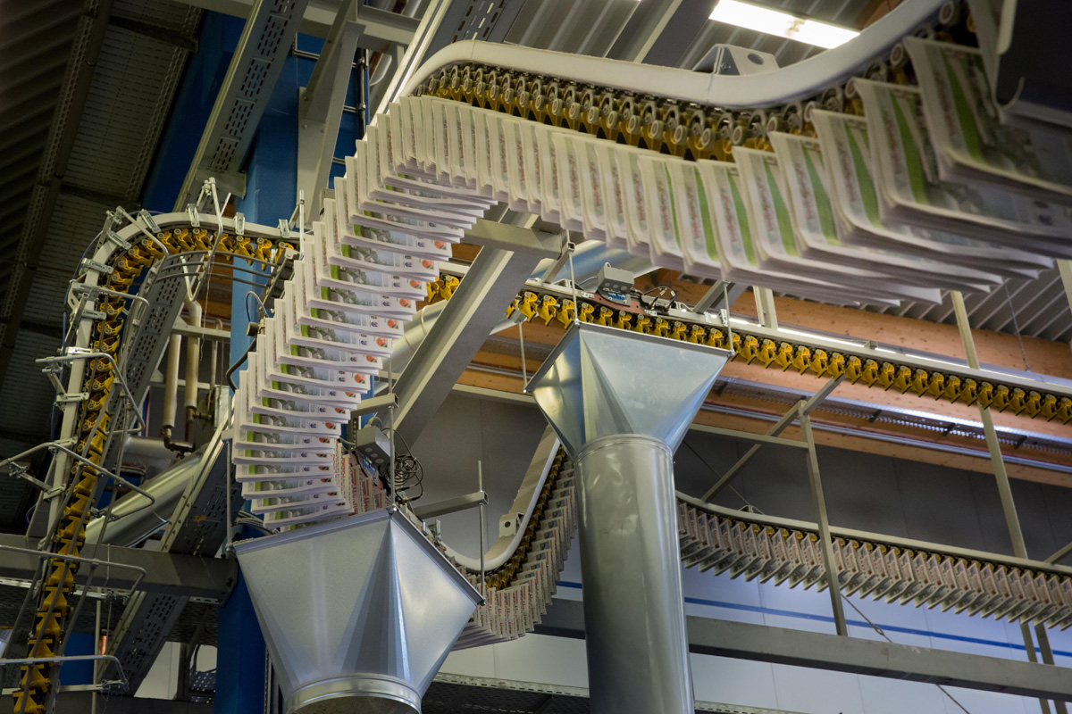 Während die Zeitungslagen früher über ebenerdige Förderbänder geführt wurden, haben die Förderketten nun den Weg frei gemacht für eine Umgestaltung des Materialflusses und der Produktionsabläufe. Sie stellen auch einen wichtigen Schritt zu einer Automatisierung von bisher manuell erledigten Produktionsschritten dar. So werden die großen Umfänge und Auflagen in Föhren nach dem Kreuzleger nun direkt zu einem Lagenpalettierer weitergeleitet.